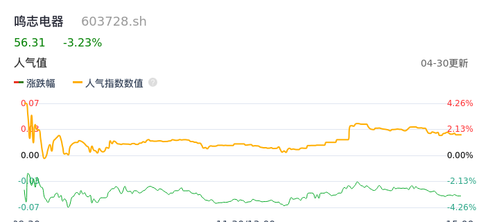 04月30日,鸣志电器收报56.31,股价涨幅-3.23%,成交金额4.26亿元,换手率1.80%。