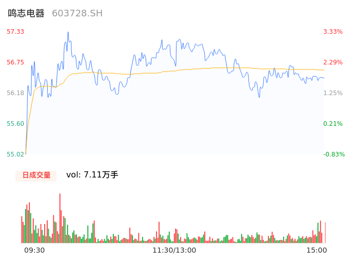 04月26日,鸣志电器收报56.46,股价涨幅1.77%,成交金额4.02亿元,换手率1.70%。