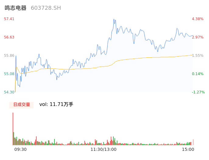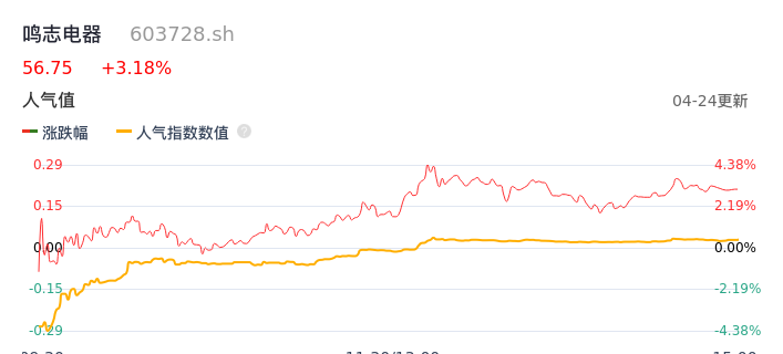 04月24日,鸣志电器收报56.75,股价涨幅3.18%,成交金额6.54亿元,换手率2.80%。