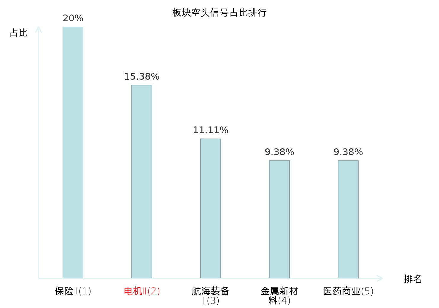 全市场所有行业板块中主力空头信号占比排名中,保险Ⅱ板块位居第一。塑料板块名次提升最快,较昨日上升111位。