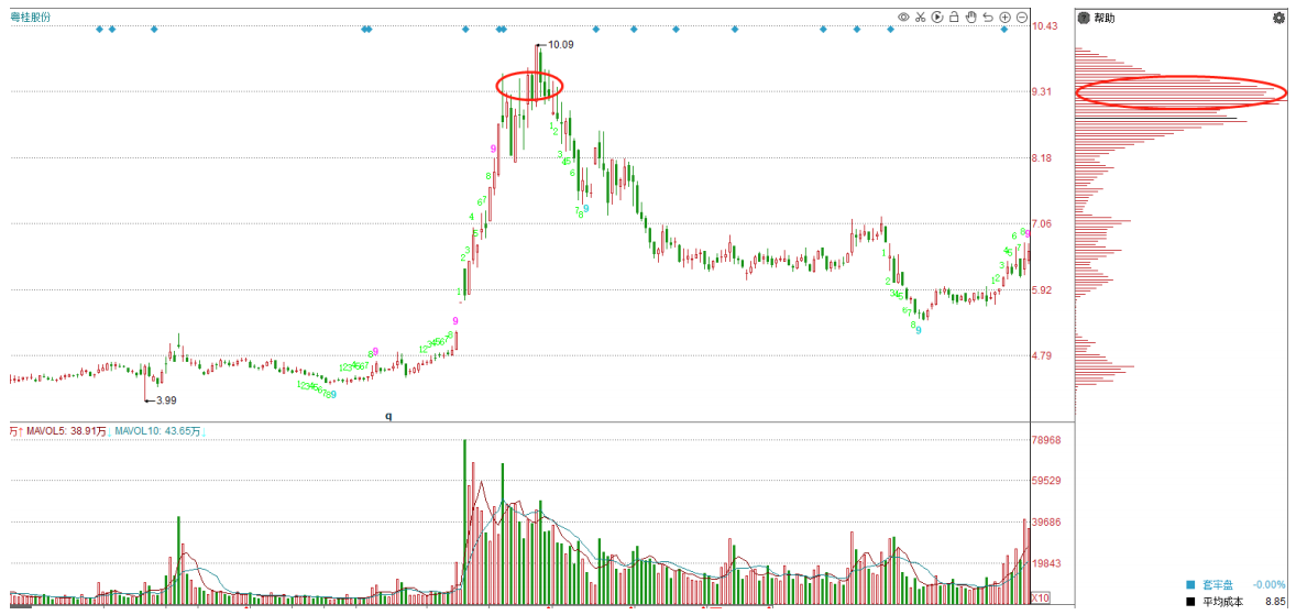 粤桂股份在 2021 年 9 月初在 9-9.5 元区域形成了高位密集单峰,从图上可以看到此时前期上涨过程中一些低位的密集峰基本上萎缩殆尽,随后股价下行跌破高位密集单峰区域。