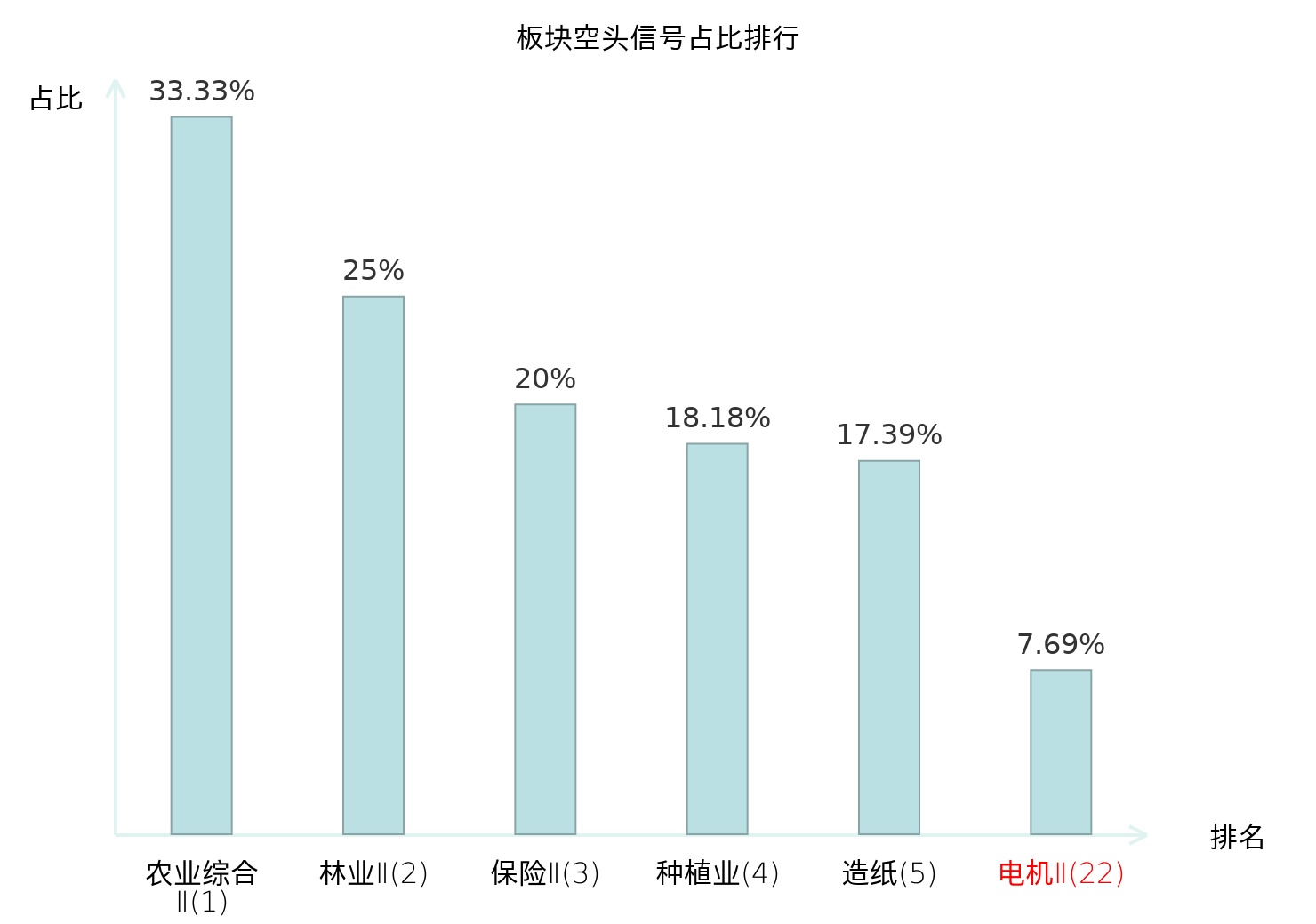全市场所有行业板块中主力空头信号占比排名中,农业综合Ⅱ板块位居第一。炼化及贸易板块名次提升最快,较昨日上升115位。