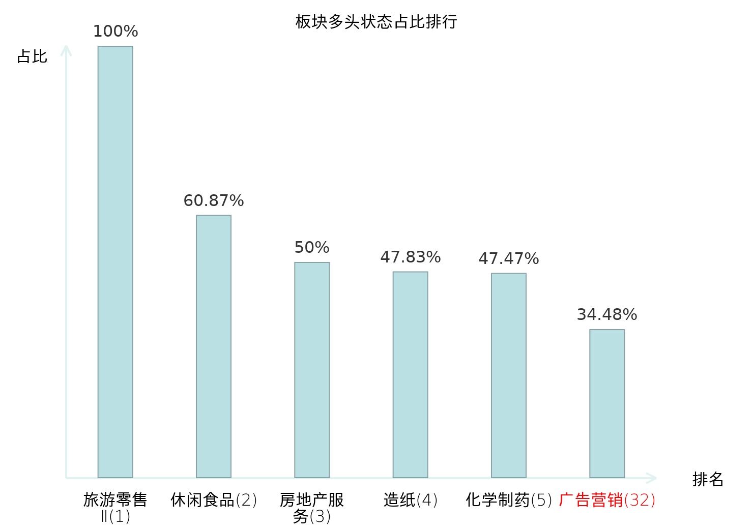 全市场所有行业板块中主力多头状态占比排名中,旅游零售Ⅱ板块位居第一。种植业板块名次提升最快,较昨日上升49位。