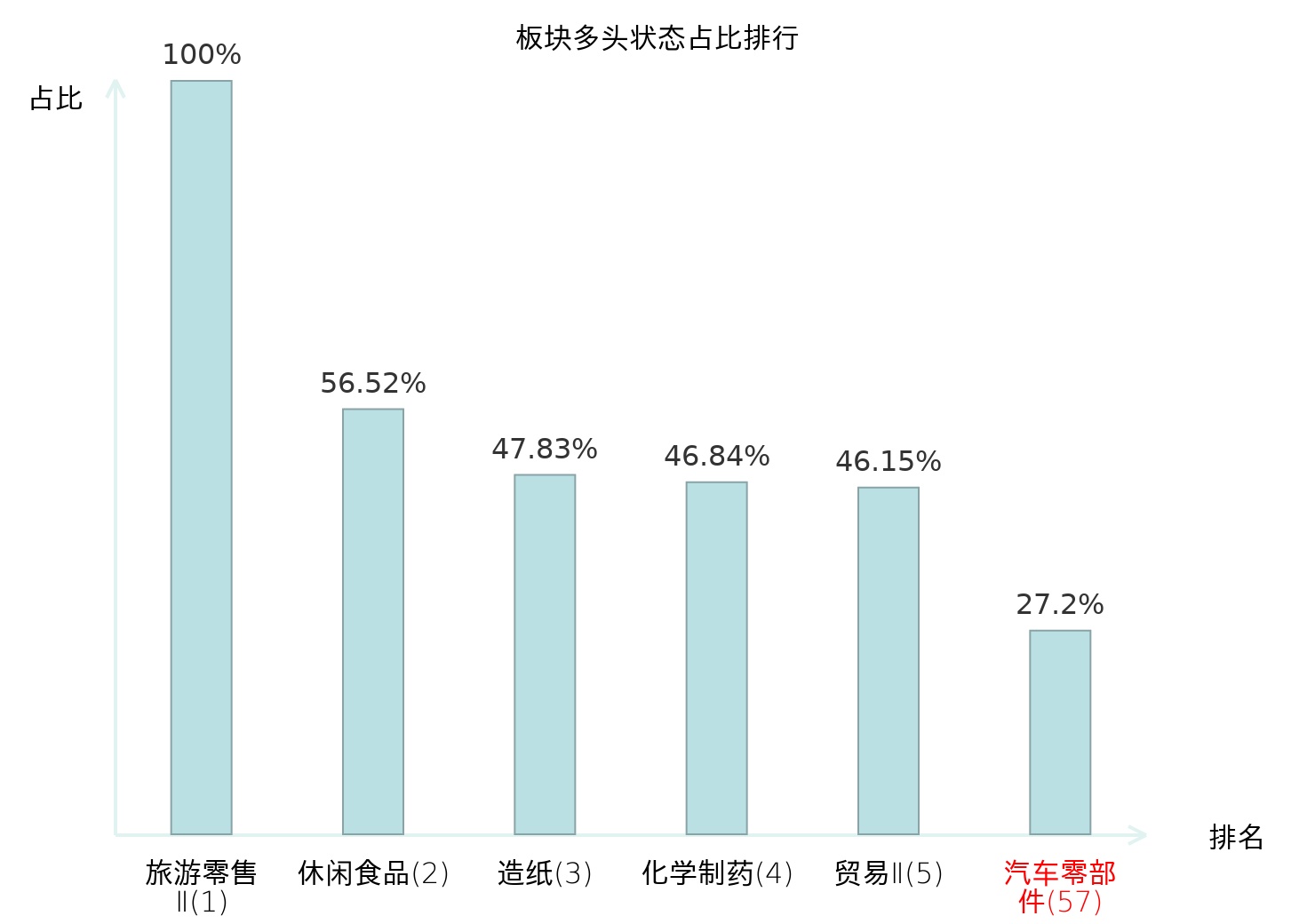 全市场所有行业板块中主力多头状态占比排名中,旅游零售Ⅱ板块位居第一。动物保健Ⅱ板块名次提升最快,较昨日上升58位。