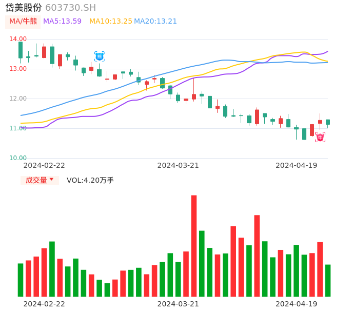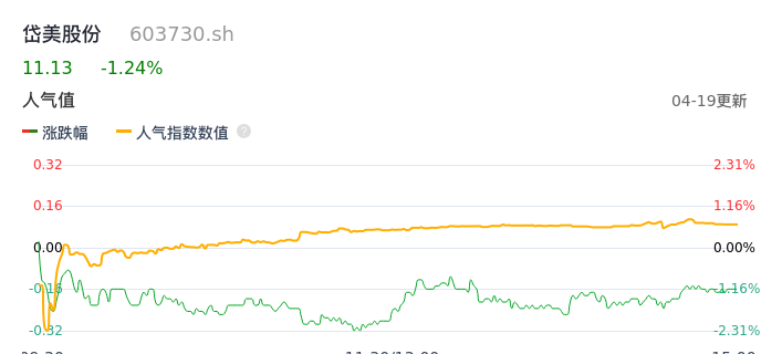 04月19日,岱美股份收报11.13,股价涨幅-1.24%,成交金额4665.70万元,换手率0.33%。