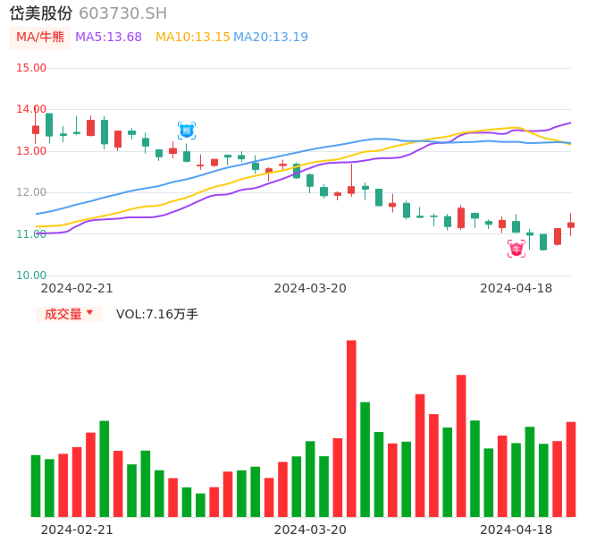 04月18日,岱美股份收报11.27,股价涨幅1.26%,成交金额8086.49万元,换手率0.56%。
