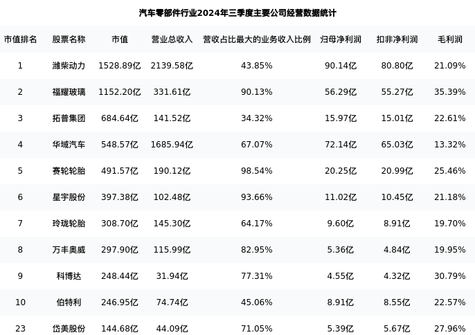 岱美股份最新报告期数据为三季度,下表汇总了汽车零部件行业内市值靠前的公司三季度主要经营数据