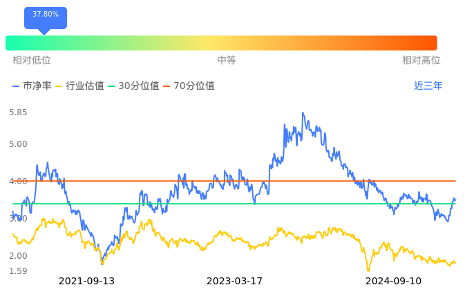岱美股份当前市净率PB为3.52,在所属的汽车零部件中,市净率PB排189,前五名分别为渤海汽车市净率0.55、奥福环保市净率0.66、一汽富维市净率0.66、天润工业市净率0.78、贵州轮胎市净率0.78。岱美股份当前市净率PB为3.52,超过近3年37.80%的历史数据。