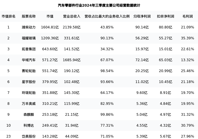岱美股份最新报告期数据为三季度,下表汇总了汽车零部件行业内市值靠前的公司三季度主要经营数据