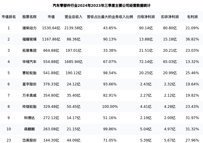 岱美股份最新报告期数据为三季度,下表汇总了汽车零部件行业内市值靠前的公司三季度主要经营数据