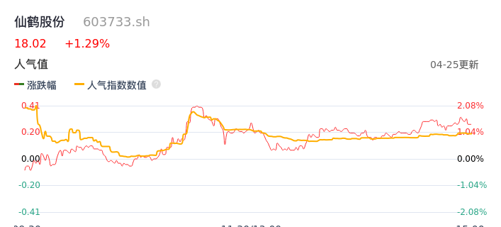 04月25日,仙鹤股份收报18.02,股价涨幅1.29%,成交金额7420.82万元,换手率0.58%。