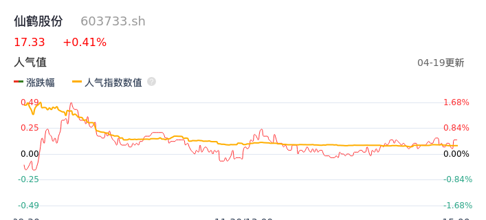 04月19日,仙鹤股份收报17.33,股价涨幅0.41%,成交金额3992.79万元,换手率0.33%。
