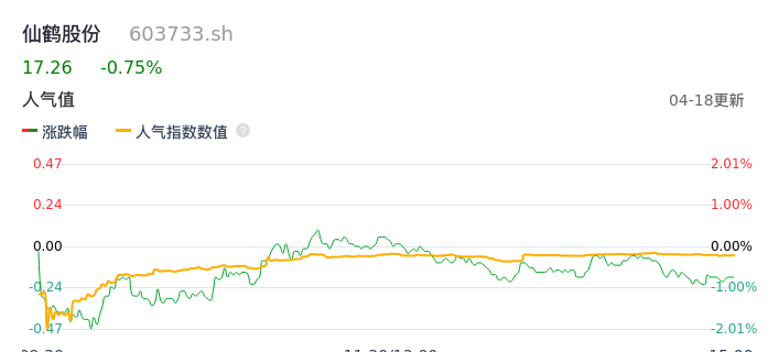 04月18日,仙鹤股份收报17.26,股价涨幅-0.75%,成交金额4405.53万元,换手率0.36%。