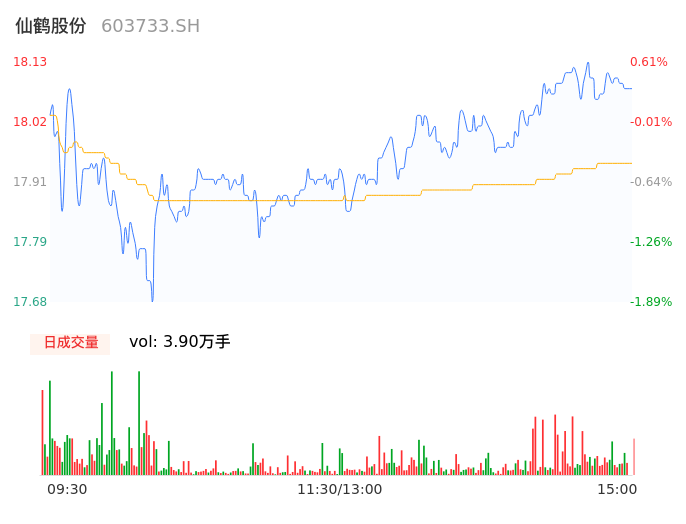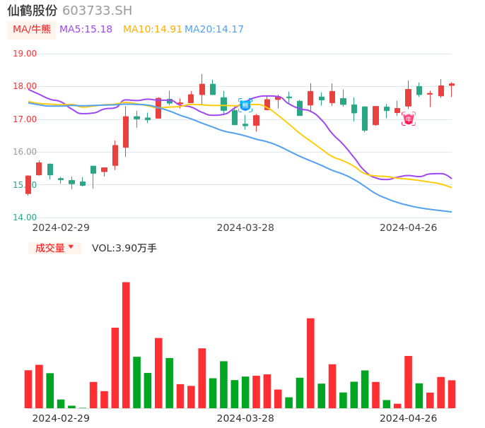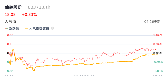 04月26日,仙鹤股份收报18.08,股价涨幅0.33%,成交金额7003.08万元,换手率0.55%。