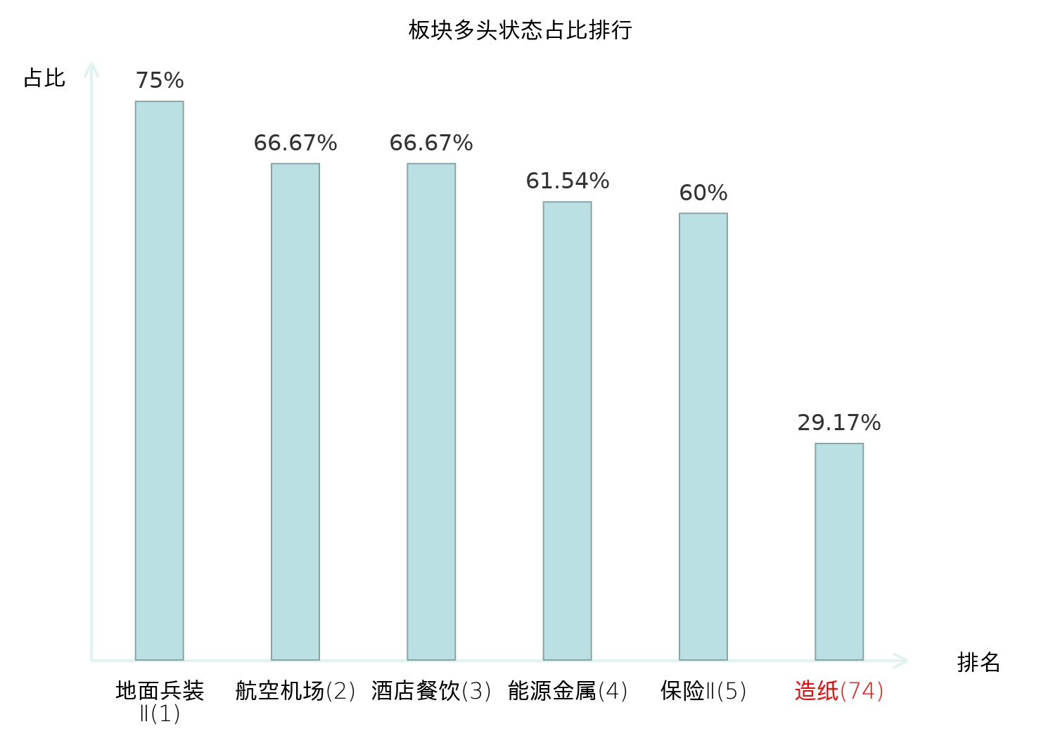 全市场所有行业板块中主力多头状态占比排名中,地面兵装Ⅱ板块位居第一。航天装备Ⅱ板块名次提升最快,较昨日上升103位。
