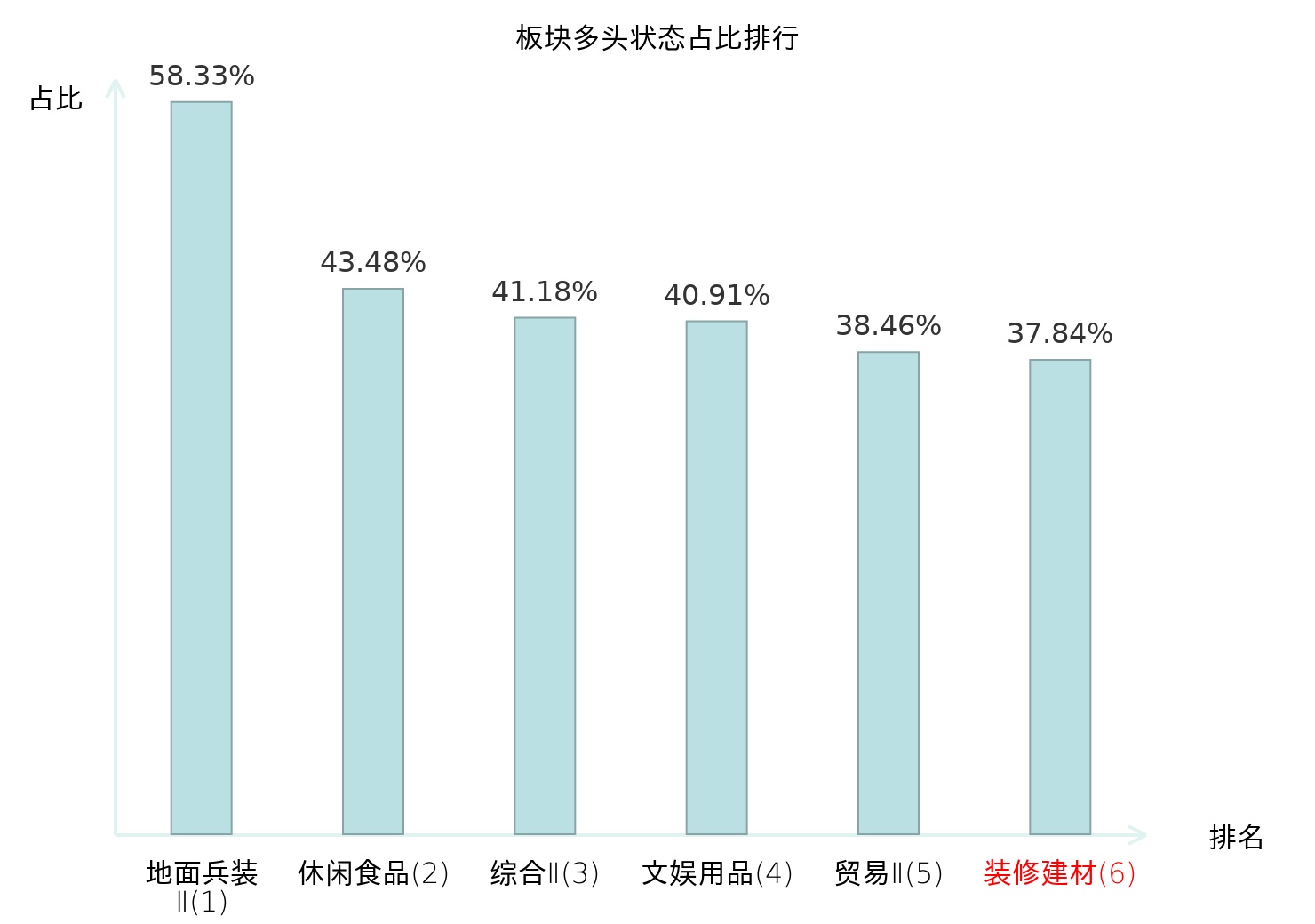 全市场所有行业板块中主力多头状态占比排名中,地面兵装Ⅱ板块位居第一。林业Ⅱ板块名次提升最快,较昨日上升90位。