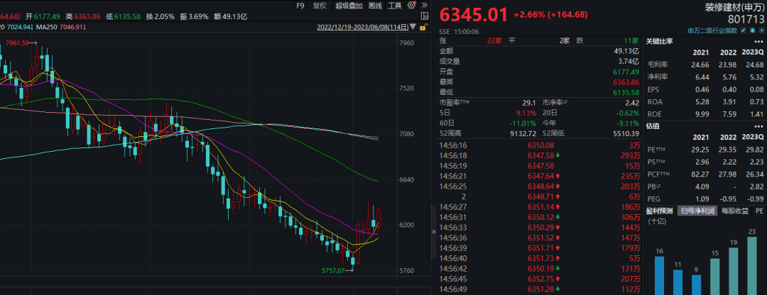 6月8日,申万装修建材指数大涨2.66%。成份股中,兔宝宝尾盘拉涨停,共计2.06万手封单;中铁装配涨6.24%;坚朗五金、北新建材和森泰股份均涨超4%。