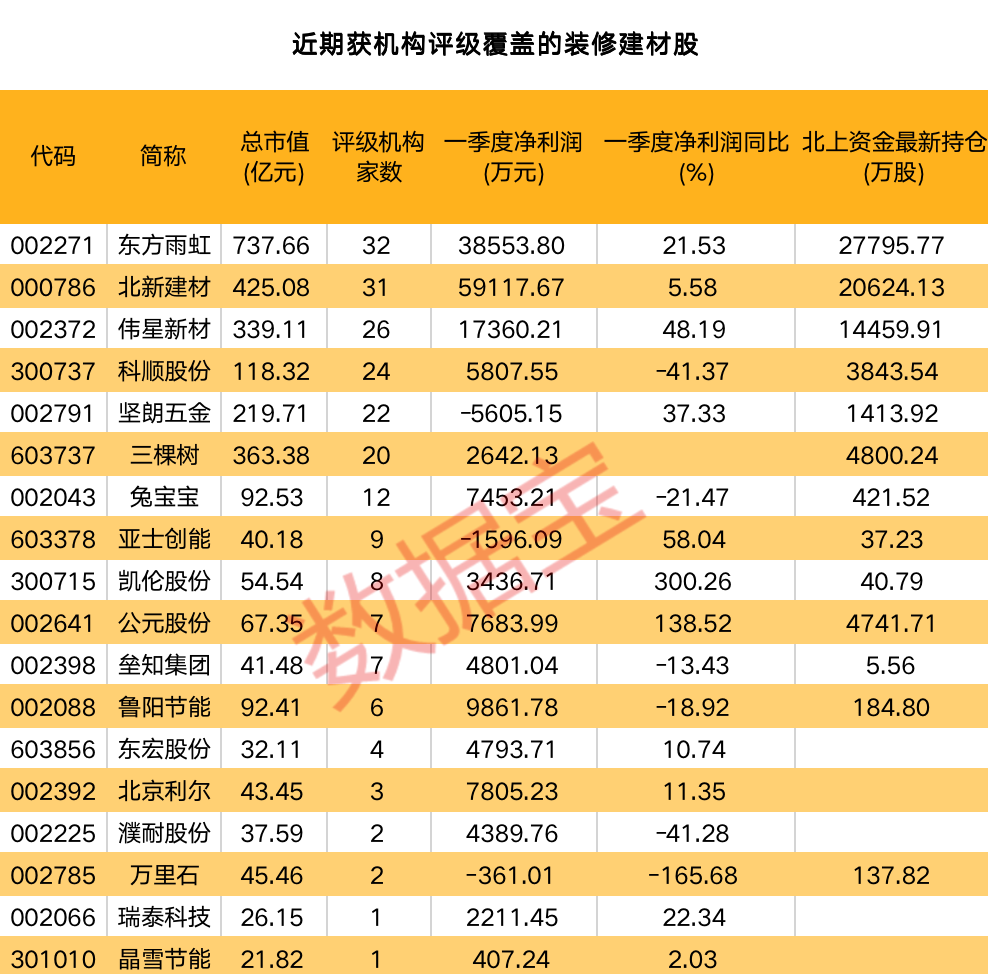 证券时报·数据宝统计,近期获机构评级覆盖的装修建材股共计18只。东方雨虹、北新建材和伟星新材评级机构数量居前,分别有32家、31家和26家;其后科顺股份、坚朗五金和三棵树评级机构数量也不低于20家。