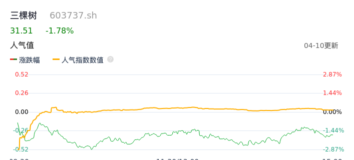 04月10日,三棵树收报31.51,股价涨幅-1.78%,成交金额2.13亿元,换手率1.28%。