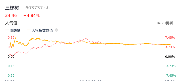 04月29日,三棵树收报34.46,股价涨幅4.84%,成交金额2.72亿元,换手率1.51%。
