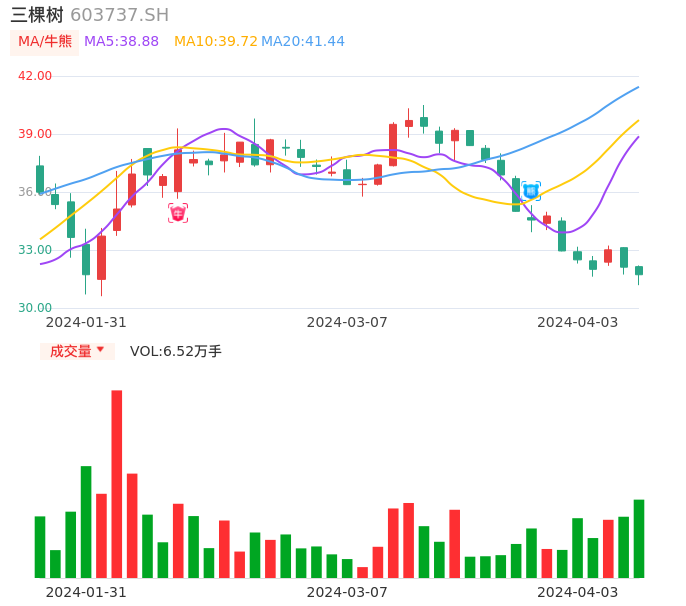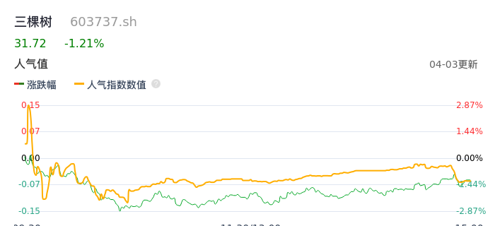 04月03日,三棵树收报31.72,股价涨幅-1.21%,成交金额2.06亿元,换手率1.24%。