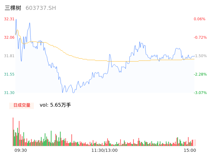 04月23日,三棵树收报31.80,股价涨幅-1.52%,成交金额1.79亿元,换手率1.07%。