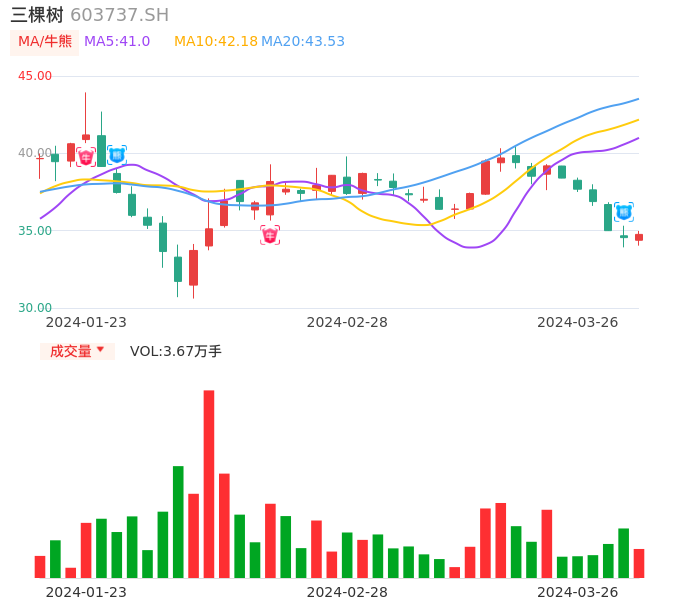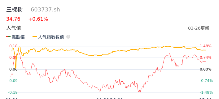 03月26日,三棵树收报34.76,股价涨幅0.61%,成交金额1.27亿元,换手率0.70%。