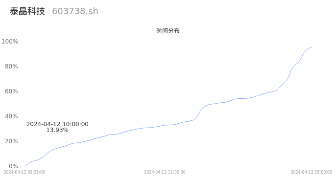 603738泰晶科技2024年04月12日成交6.09万手,成交金额7932.68万元,相较昨日放量1.21万手,换手率1.57%,成交清淡。