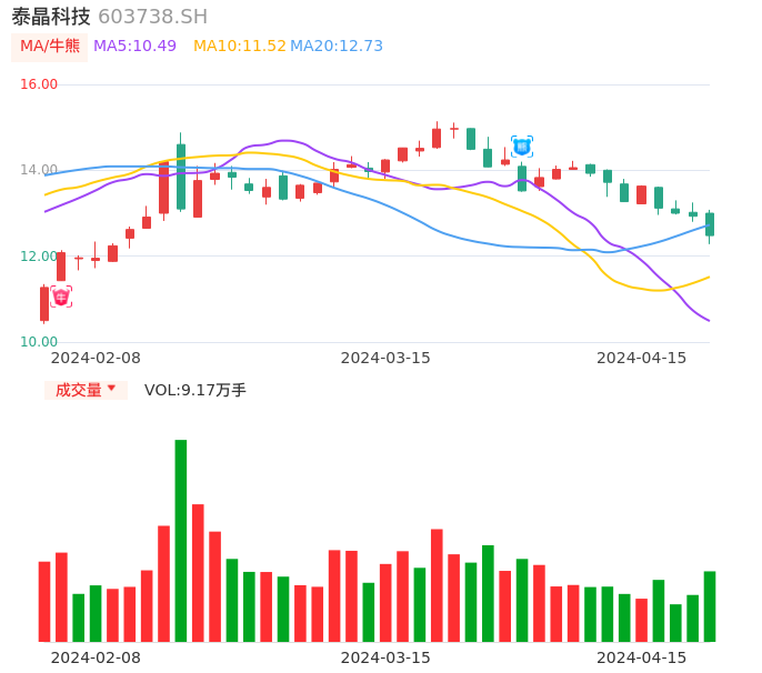 04月15日,泰晶科技收报12.48,股价涨幅-3.48%,成交金额1.15亿元,换手率2.35%。