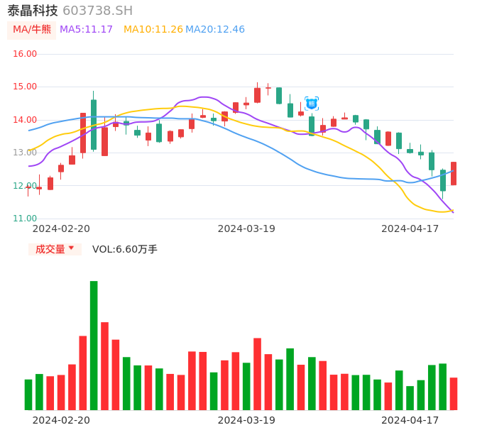 04月17日,泰晶科技收报12.71,股价涨幅7.35%,成交金额8248.80万元,换手率1.70%。
