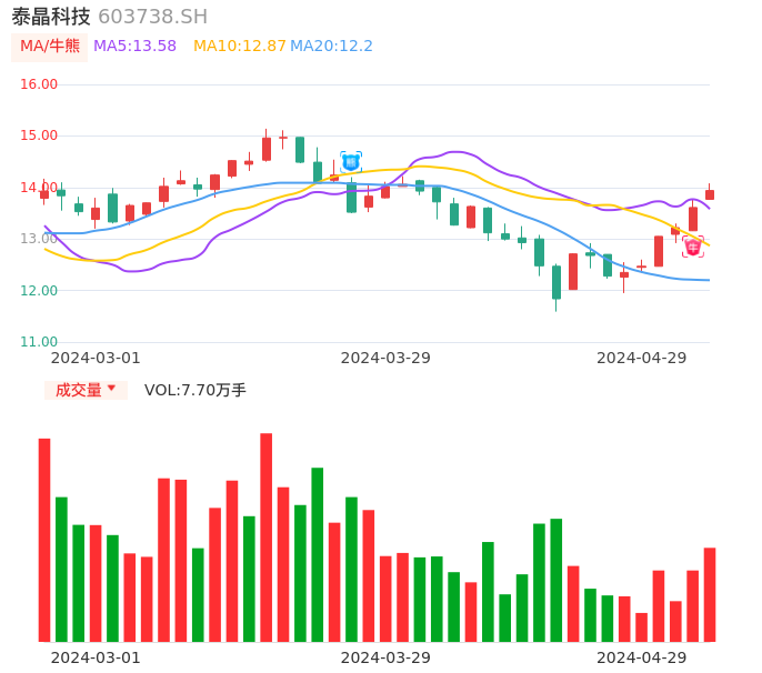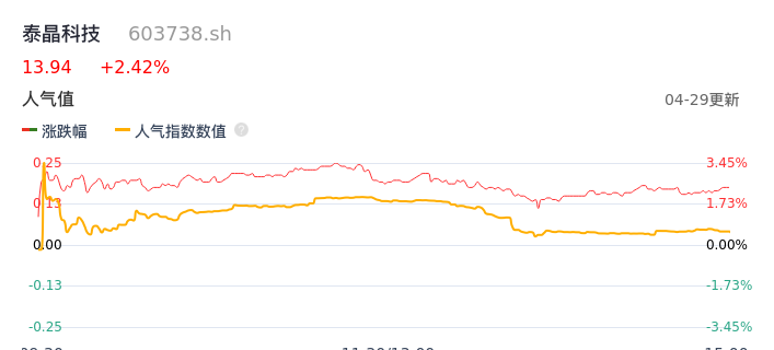 04月29日,泰晶科技收报13.94,股价涨幅2.42%,成交金额1.07亿元,换手率1.98%。