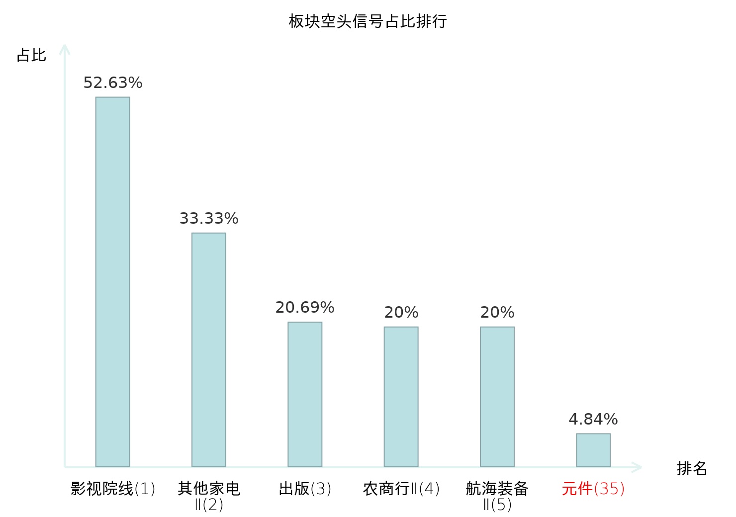 全市场所有行业板块中主力空头信号占比排名中,影视院线板块位居第一。出版板块名次提升最快,较昨日上升115位。