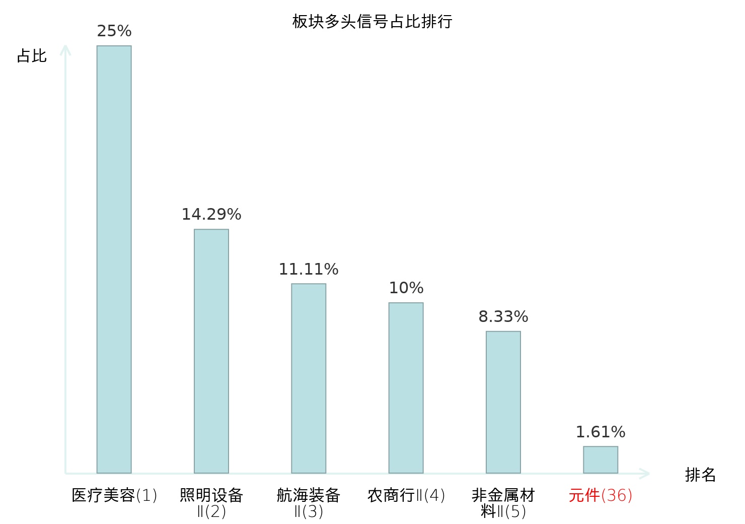 全市场所有行业板块中主力多头信号占比排名中,医疗美容板块位居第一。医疗美容板块名次提升最快,较昨日上升126位。