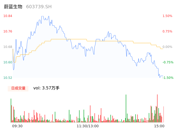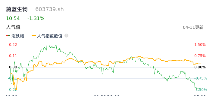 04月11日,蔚蓝生物收报10.54,股价涨幅-1.31%,成交金额3805.64万元,换手率1.41%。