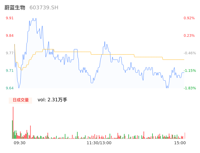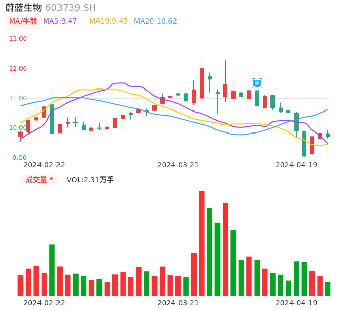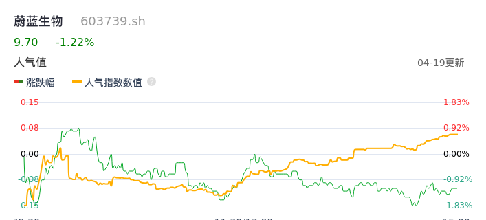 04月19日,蔚蓝生物收报9.70,股价涨幅-1.22%,成交金额2253.00万元,换手率0.91%。