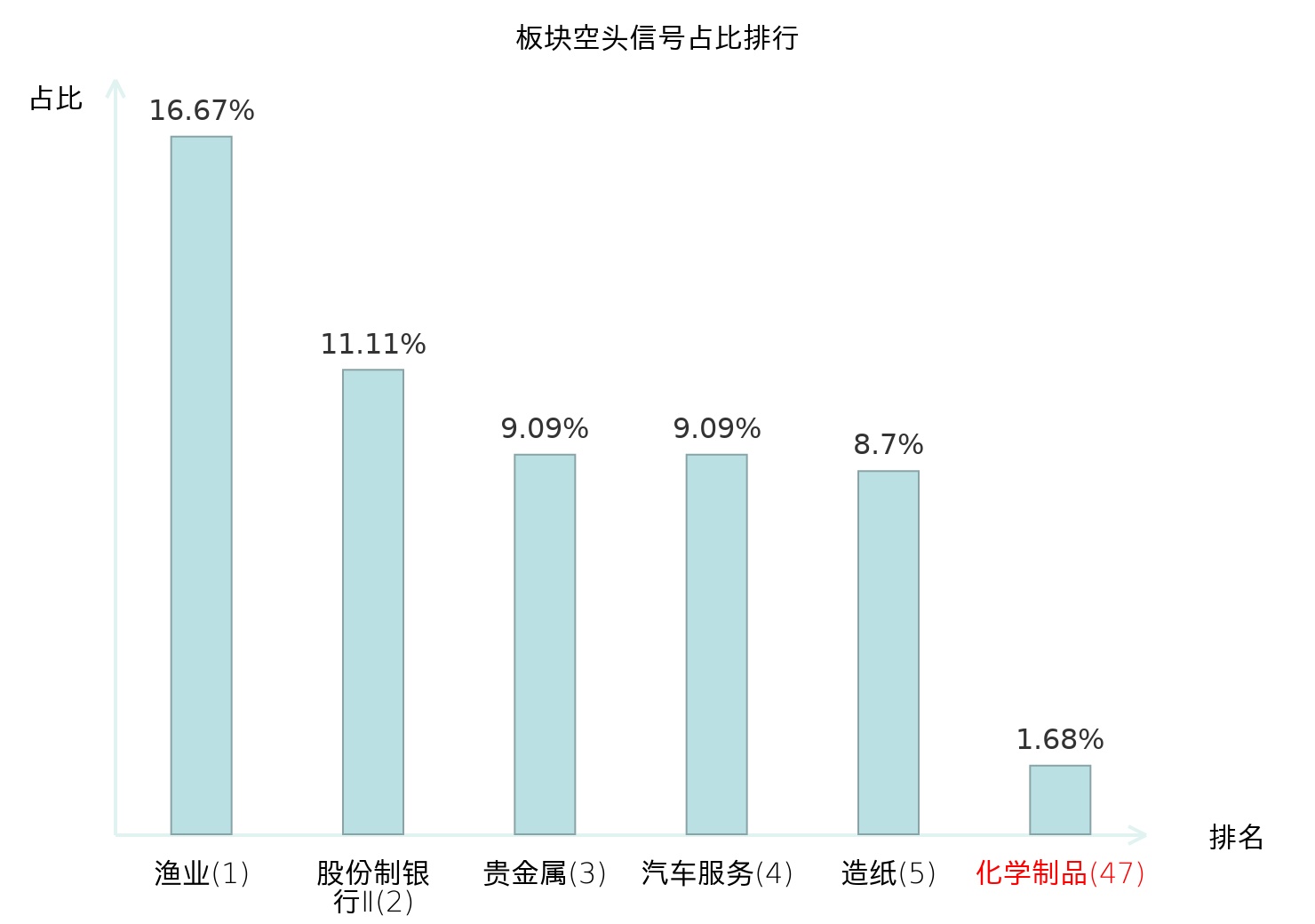 全市场所有行业板块中主力空头信号占比排名中,渔业板块位居第一。电机Ⅱ板块名次提升最快,较昨日上升113位。