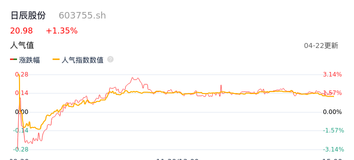 04月22日,日辰股份收报20.98,股价涨幅1.35%,成交金额1739.67万元,换手率0.84%。