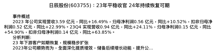 值得注意的是:2024年04月华西证券的寇星/卢周伟分析师,首次发布关于日辰股份的研究报告,标题为:日辰股份(603755):23年平稳收官 24年持续恢复可期。