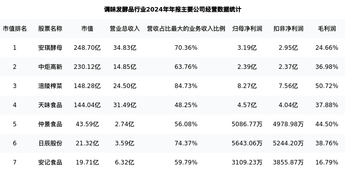 日辰股份最新报告期数据为年报,下表汇总了调味发酵品行业内市值靠前的公司年报主要经营数据
