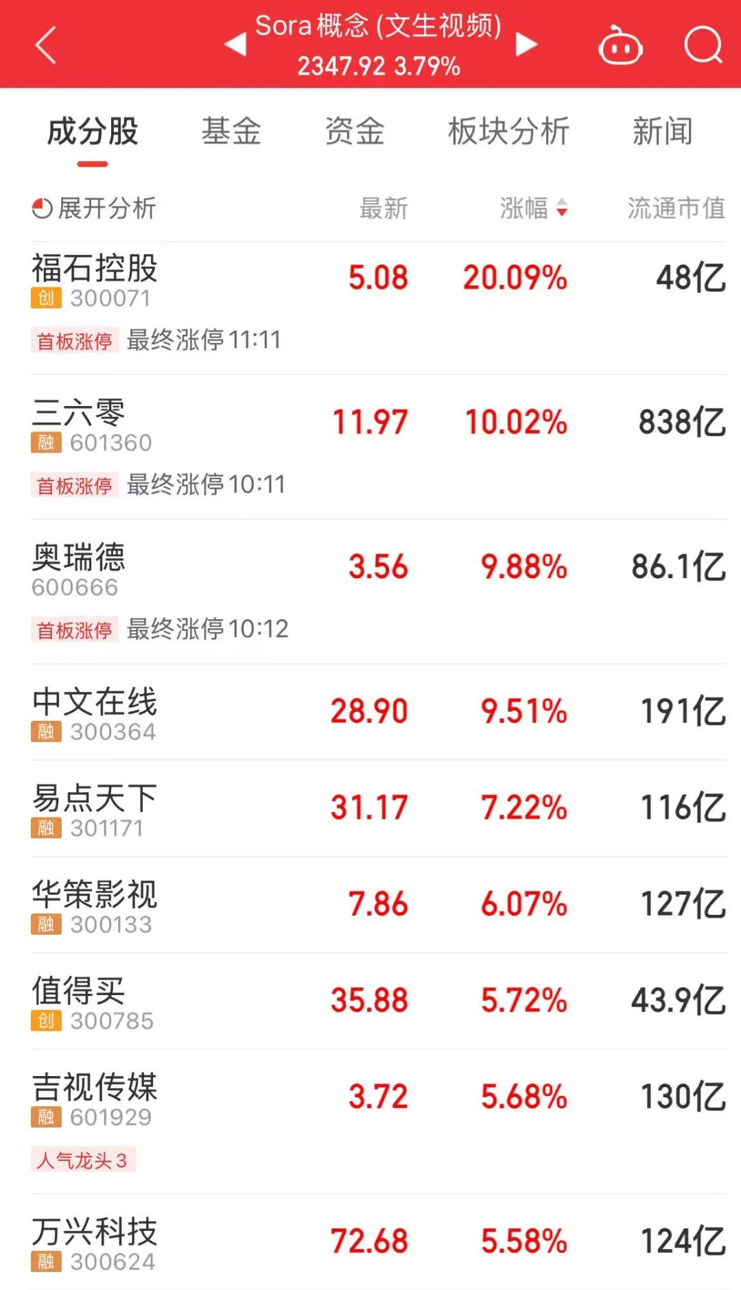 今天上午,AI应用方向走强,Sora概念、AI语料、智谱AI等板块涨幅居前。