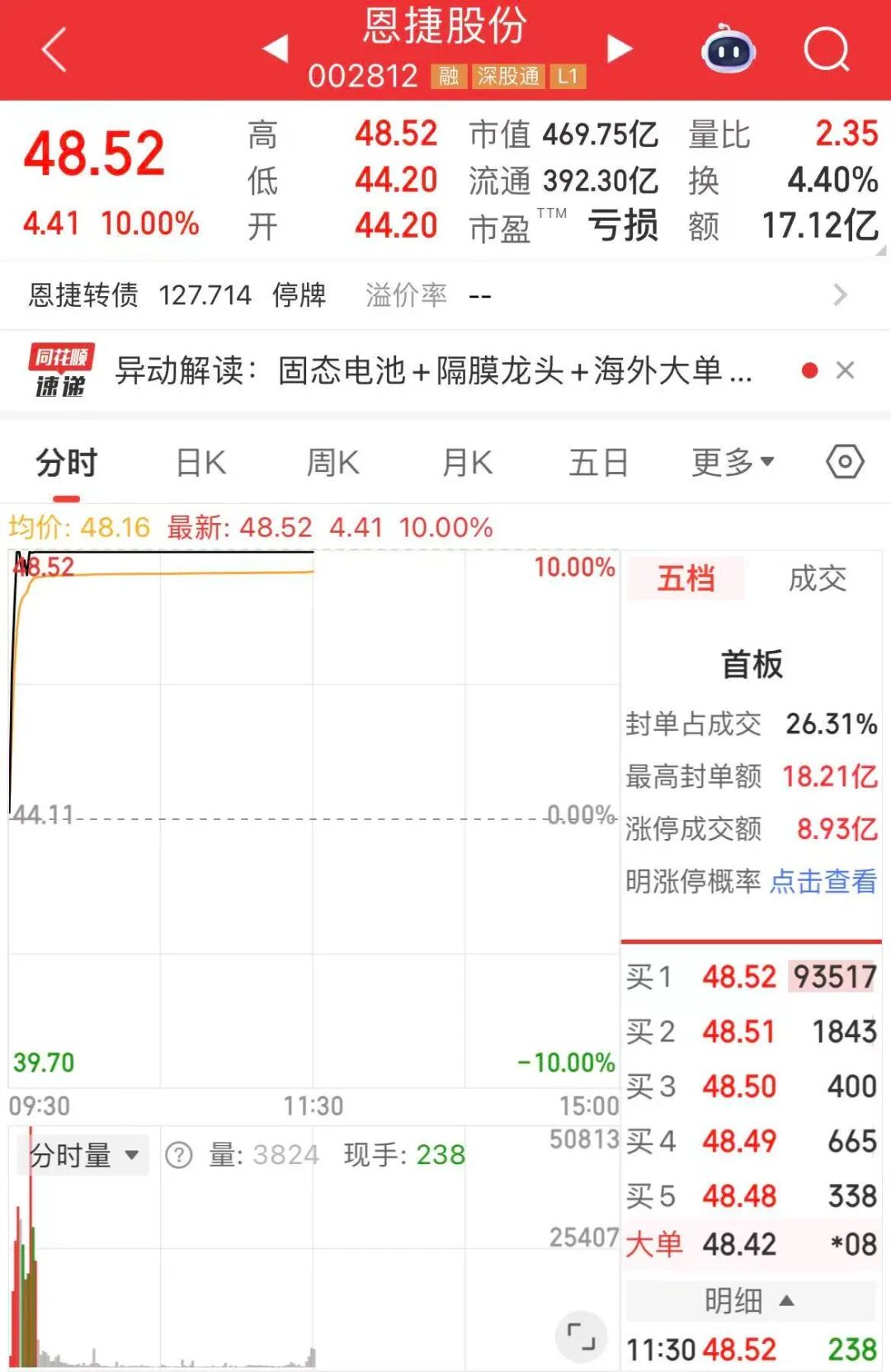 算力和半导体产业链调整,新易盛、工业富联、澜起科技等个股大跌;新能源、医药、大消费、AI应用等板块上涨。三六零、药明康德、恒瑞医药、泸州老酒、金龙鱼、天赐材料、恩捷股份等龙头股上涨,其中,锂电龙头恩捷股份开盘拉升,用时仅2分钟,股价涨停。