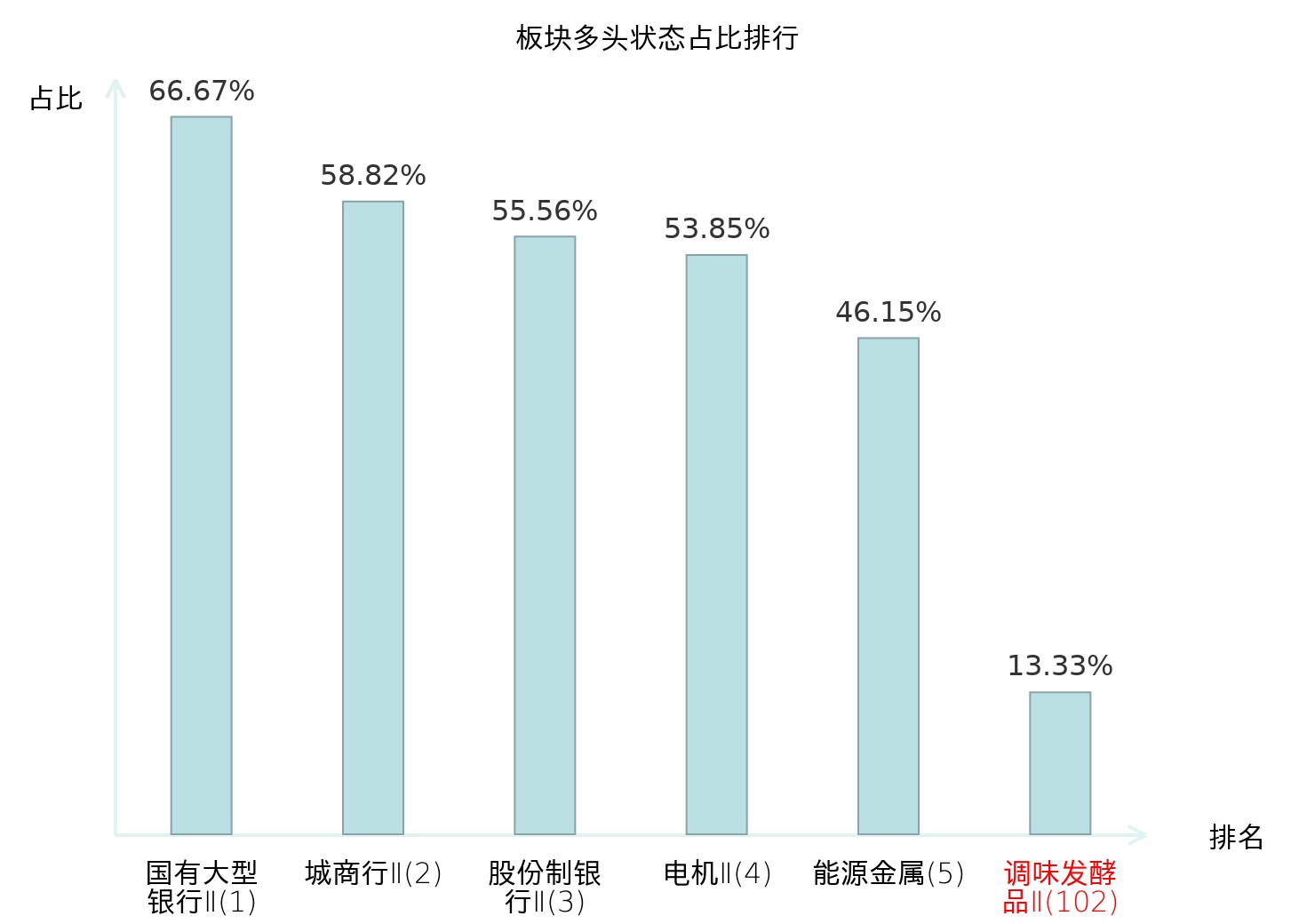全市场所有行业板块中主力多头状态占比排名中,国有大型银行Ⅱ板块位居第一。自动化设备板块名次提升最快,较昨日上升57位。