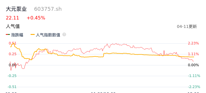 04月11日,大元泵业收报22.11,股价涨幅0.45%,成交金额1702.95万元,换手率0.46%。