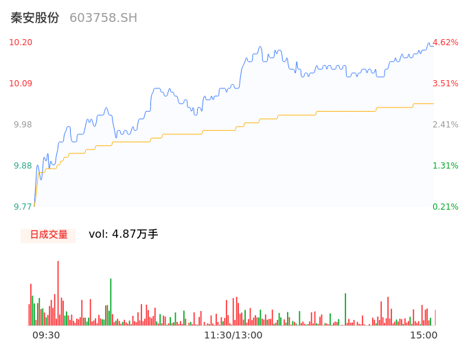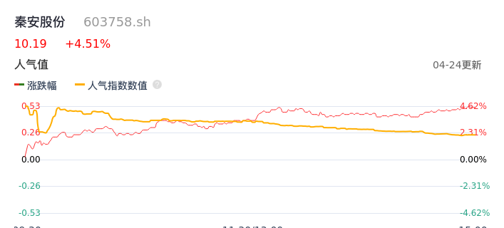 04月24日,秦安股份收报10.19,股价涨幅4.51%,成交金额4886.95万元,换手率1.11%。