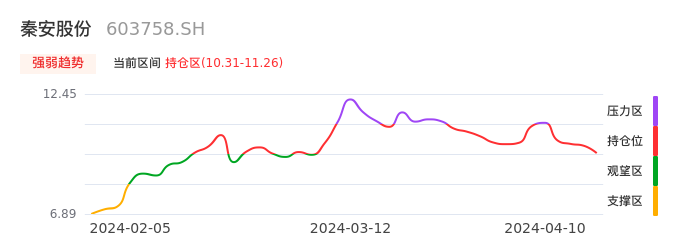 我们来看一下该股的九方特色指标强弱趋势的情况:秦安股份自04月03日从压力区回到持仓区。股价近期持续调整。后续重点关注能否站稳多空分界点:10.31元。如被有效击穿则将进入空头行情。