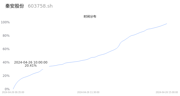 603758秦安股份2024年04月26日成交4.32万手,成交金额4398.96万元,相较昨日放量1188手,换手率0.99%,成交清淡。