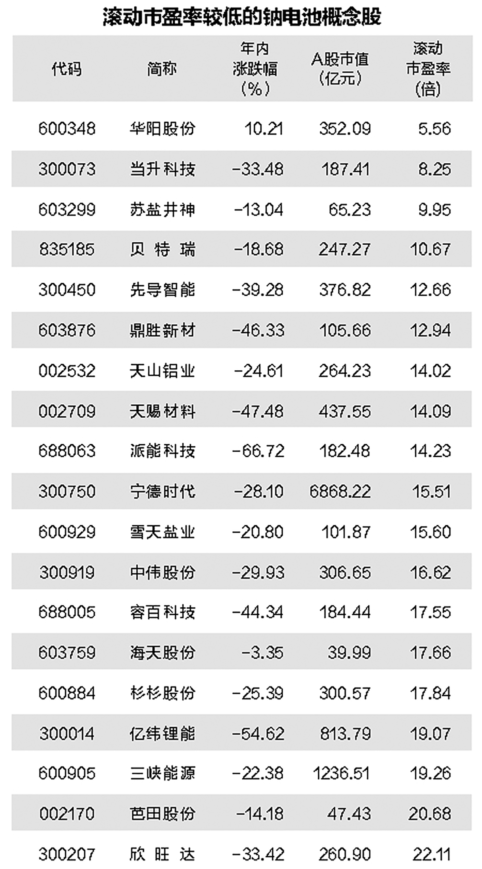 证券时报·数据宝统计,截至12月26日收盘,钠电池概念股今年以来平均下跌25.3%。8股累计跌幅超50%,包括派能科技、鹏辉能源、传艺科技、盟固利、振华新材等。