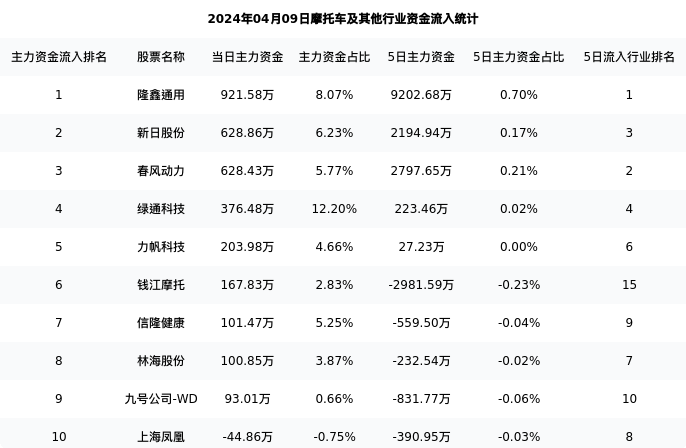 隆鑫通用今日净流入921.58万元,主力占比8.07%,在行业内排名:1/16;5日净流入9202.68万元,主力占比0.70%,在行业内排名:1/16。