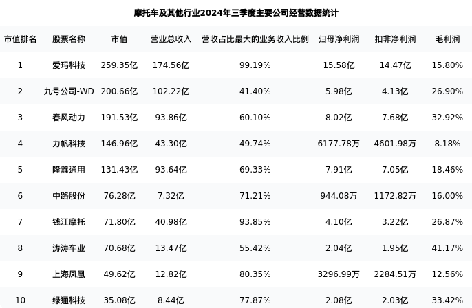 隆鑫通用最新报告期数据为三季度,下表汇总了摩托车及其他行业内市值靠前的公司三季度主要经营数据