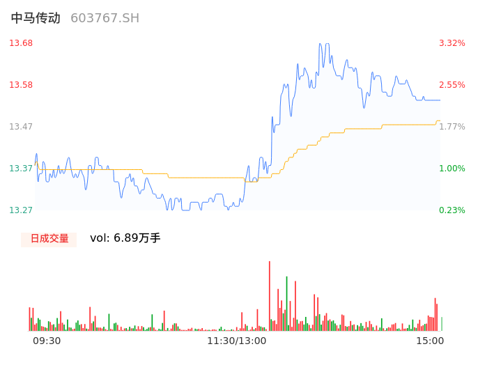 04月23日,中马传动收报13.53,股价涨幅2.19%,成交金额9296.26万元,换手率2.23%。